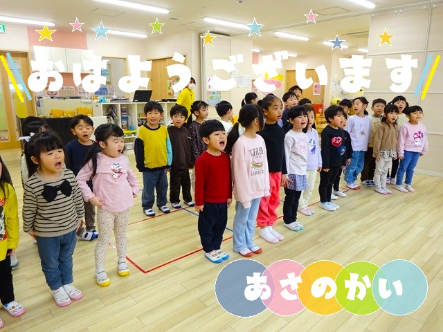 カペラ組(3歳児)・ベガ組(4歳児)・シリウス組(5歳児)みんなで集まって、朝の会を行います😊