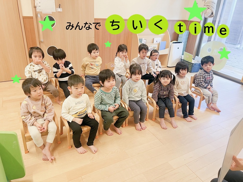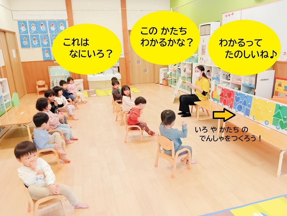 おすわりで歌や手あそびを楽しんでいた子どもたちも、今では椅子に座って知育timeをしていますよ。