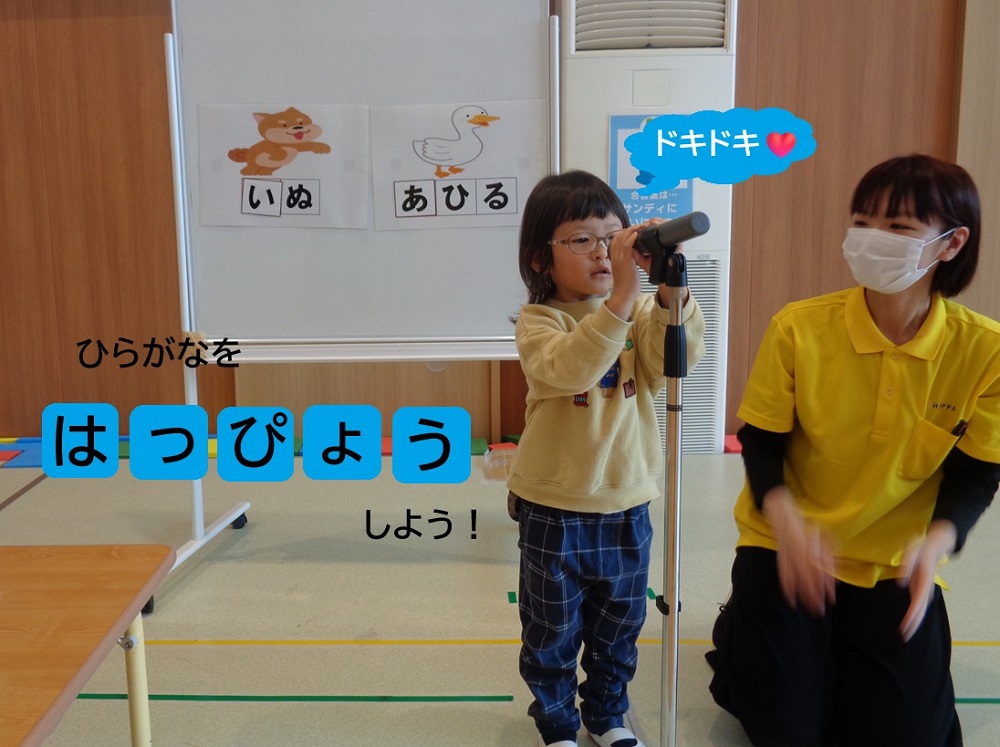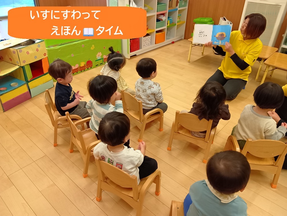 先生があいさつをするとお辞儀をしたり、あいうえおの絵本を読むと「あ・あ・あー😊」「い・い・いー😊」とリズムにのって発音を楽しんでいます。
