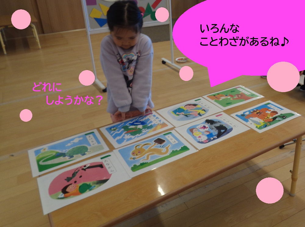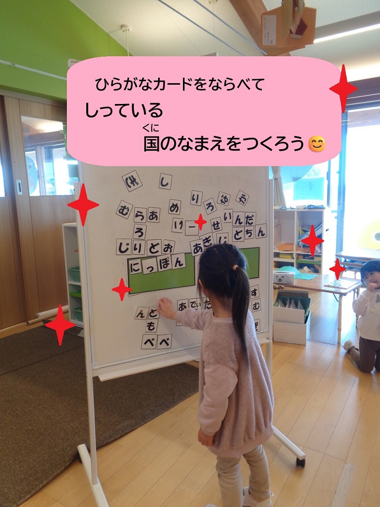 自分で好きな四字熟語やことわざを選び、意味を説明したり、ひらがなカードを使って国の名前を作ります😊