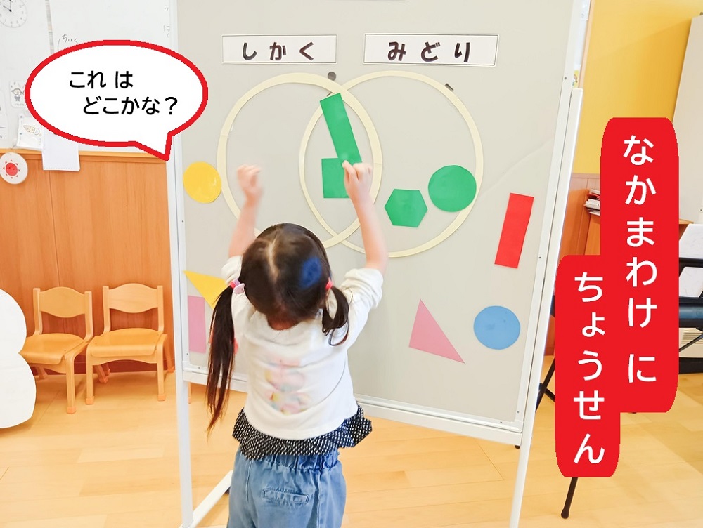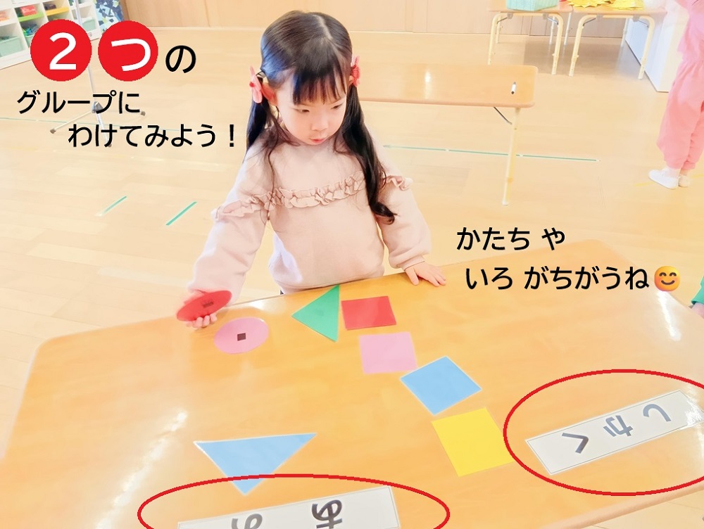 活動を通して、特に仲間分けに興味を持ち、いろいろな形を色をテーマごとに分けることを楽しんでいます!