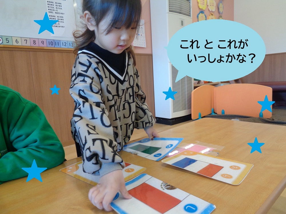 フラッシュカードのように、“どっちが多い?少ない?”と絵を見て遊びながら、直感的に数を理解する取り組みや、遊びの中でカードゲームの枚数を数えて、「私は10枚だよ😊」「○○ちゃんは4枚だね💛」などお話したり、生活の中で数を意識する機会をつくってきました。