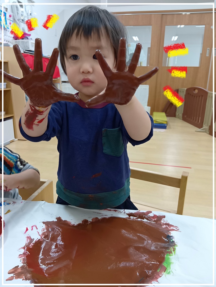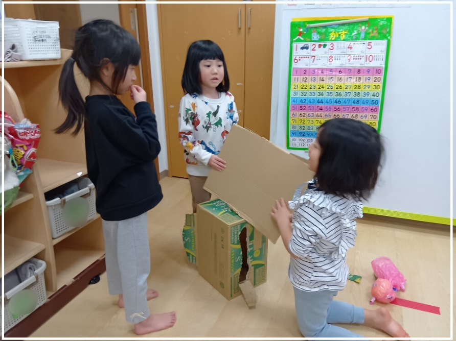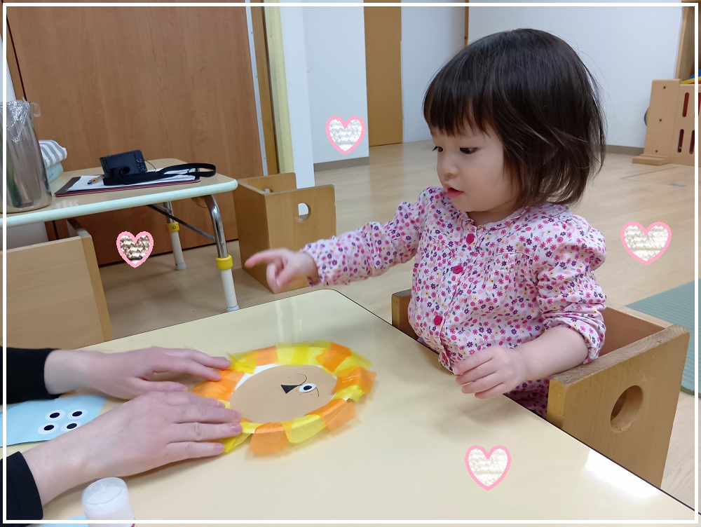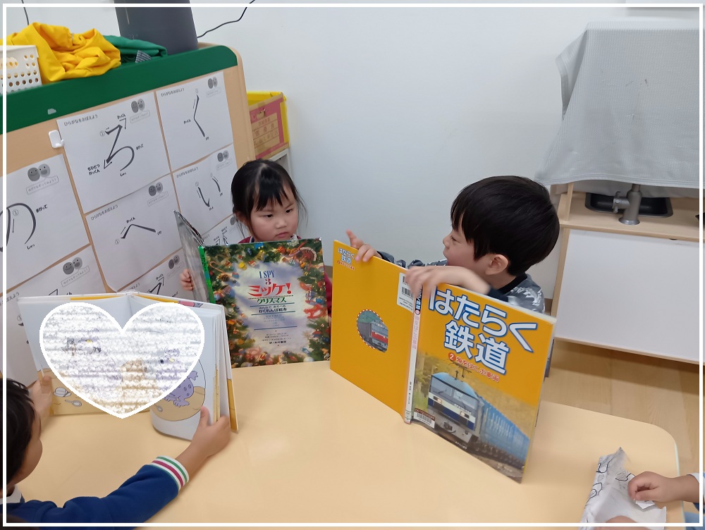 絵本やおもちゃなどの身近なもので知っている色を言ってみたり、この間には、公園の鉄棒のねじを見て「先生!六角形があるよ!」と教えてくれたりと驚かされることがたくさんです☆