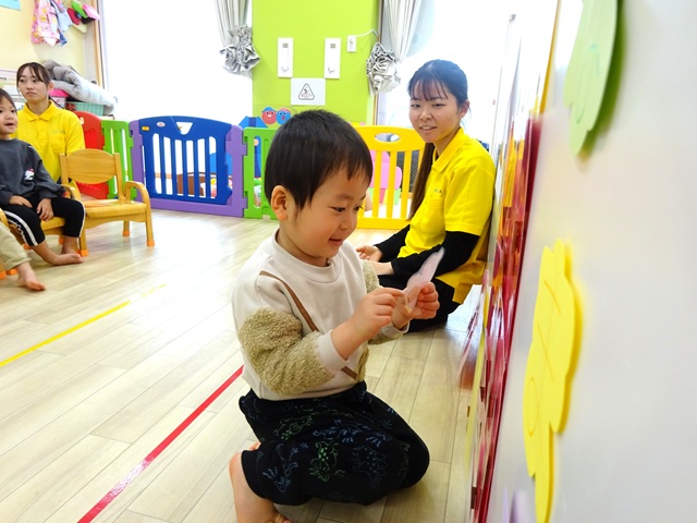 まずは、スピカ組(0歳児クラス)の子どもたちに、保育室に隠れている、ひな壇の飾りつけを探してもらいます。