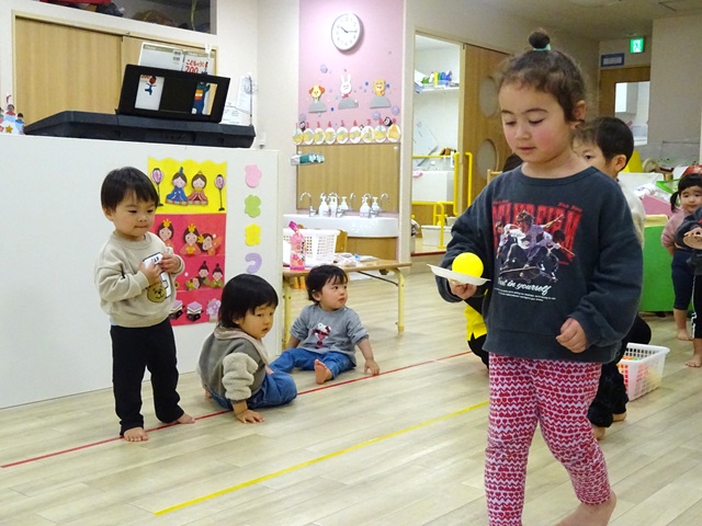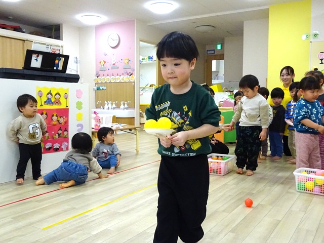 ひなあられに見立てたボールをどれだけ多く運べるか競争しました。