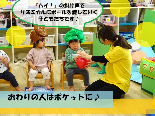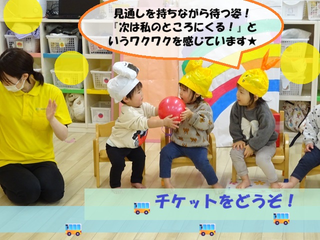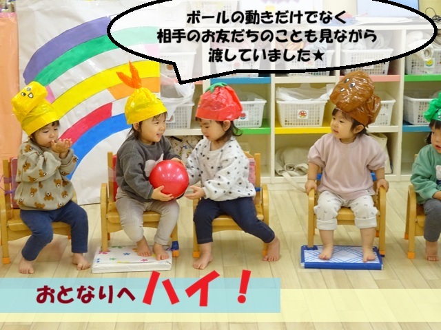 『おおがたバス』の歌に合わせ、お隣のお友だちへ手渡していきます☆