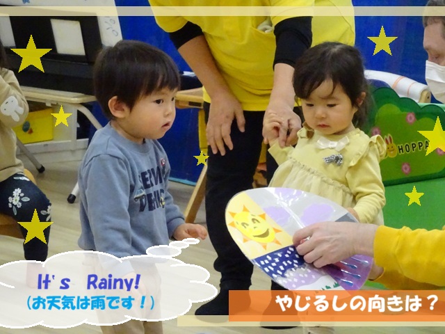 『It’s rainy and cold(今日のお天気は雨、そして寒いです)』をみんなで言えました♪