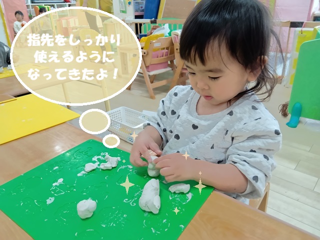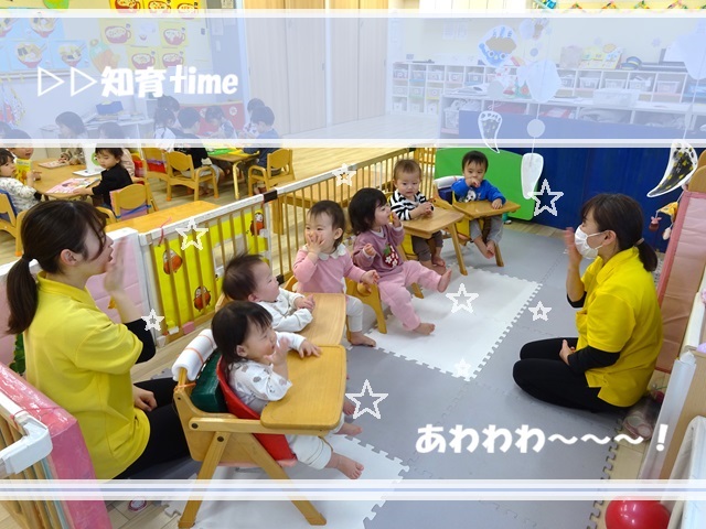 毎日の知育time、最初はきょとんと保育士を見上げる子どもたちでしたが、今では「なにがはじまるの?✨」「今日も楽しいことする?✨」とワクワクした表情で「はじまるよ~♪」という掛け声に合わせ、身体を揺らしたりニコニコ笑顔、足をバタバタ、手をぶんぶん♪