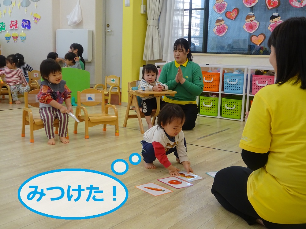 「じゃがいもはどれかな~?」と食べ物当てをしています。