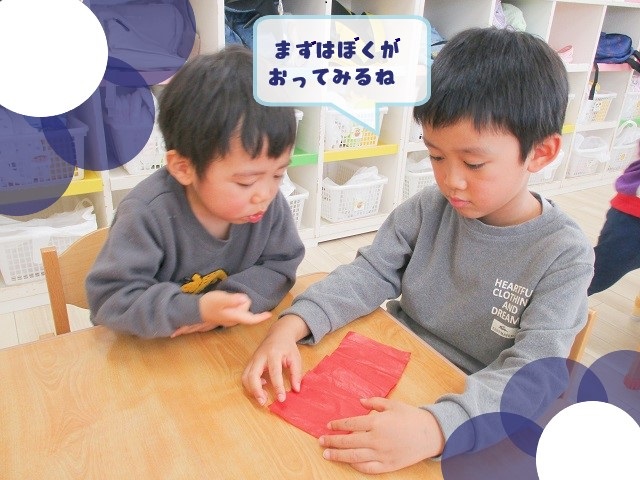 シリウス組さんが作り方を上手に伝えてくれ、自分たちで折ったり、のりをつけたりして作り上げることができていました!