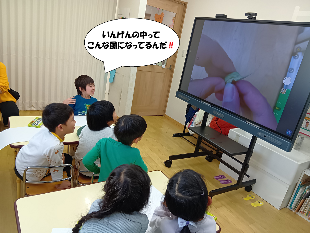 シリウスクラスのみんなが見えるように電子黒板を使用し、中から種を取り出す風景を見ました✨
