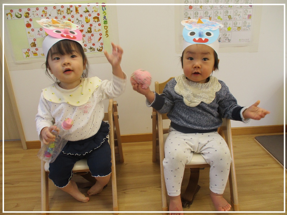 鬼のお面を上手に製作できたスピカクラス(1歳児)さん