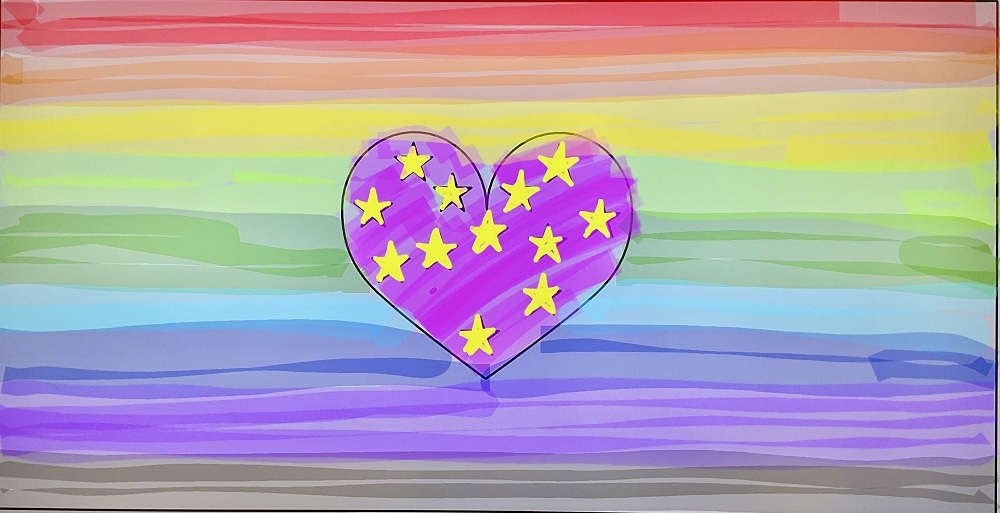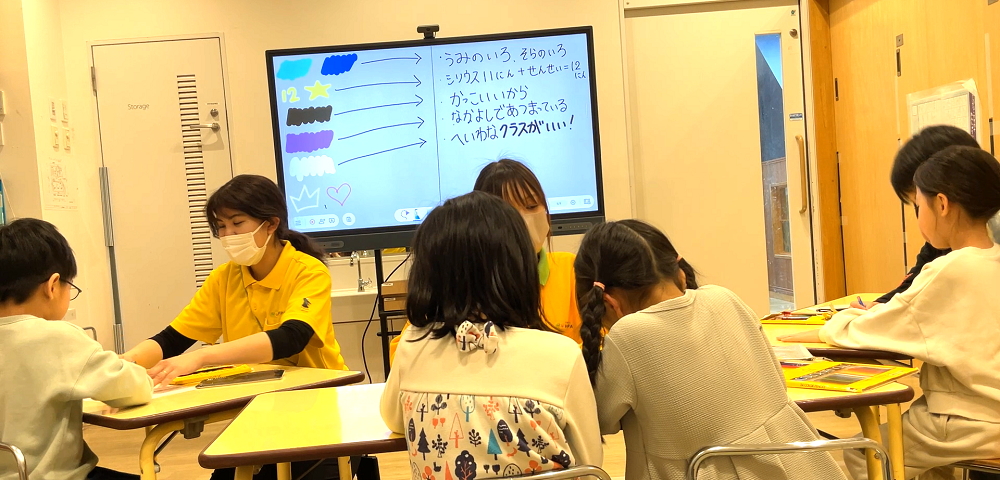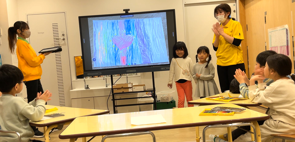 「王冠をハートの上にのせたい!」など、どのグループも積極的に意見を出しながら描き進めていました。