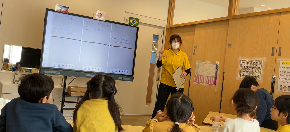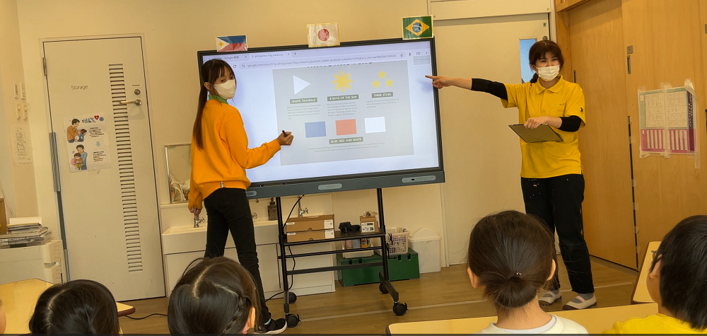 1回目のすくわくプログラムの最後に色やシンボル等、国旗の様々な違いに興味を持っていたので2回目は『国旗の意味について知る』をテーマに取り組み、担任とEnglish teacherのそれぞれの国…日本、フィリピン、ブラジルの3か国の国旗の意味について調べました。