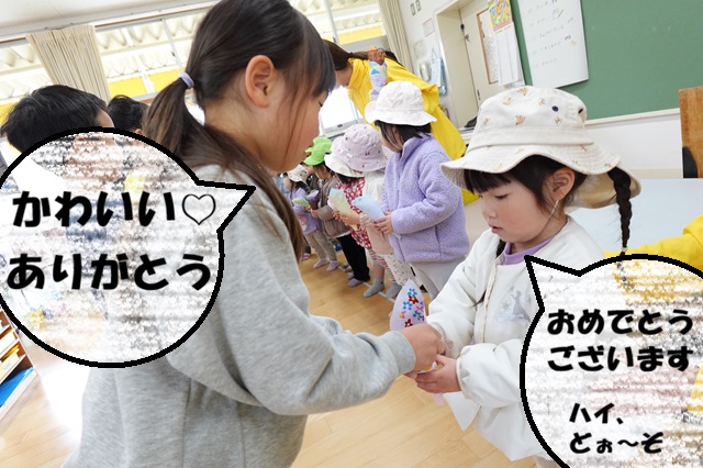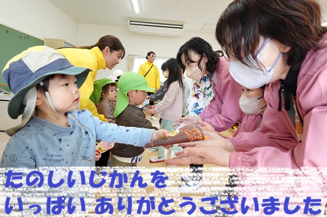 今年度最後の訪問では、卒園児の皆さんに卒園祝いのプレゼントをお渡ししました。