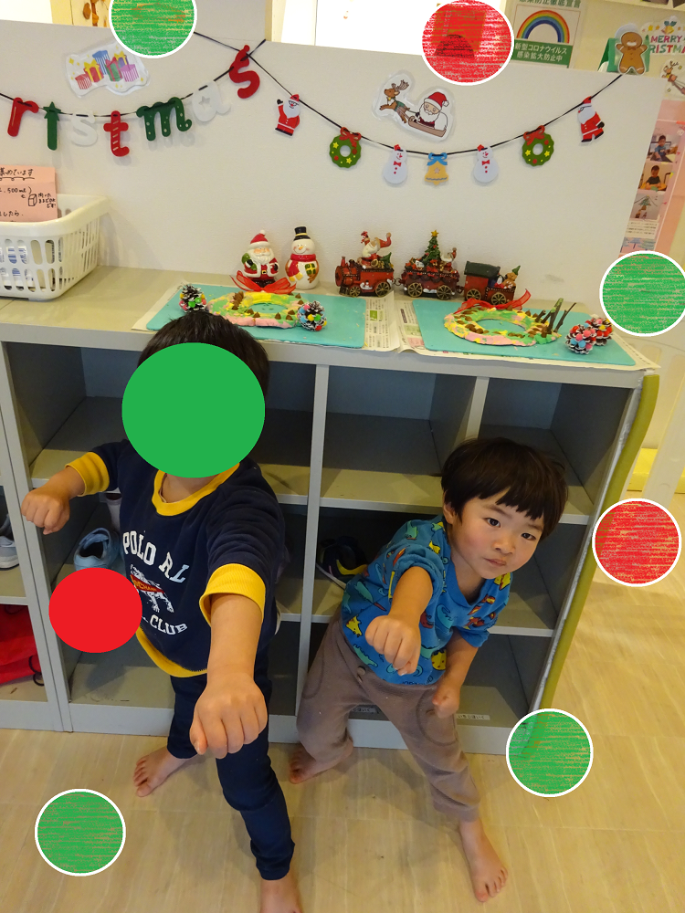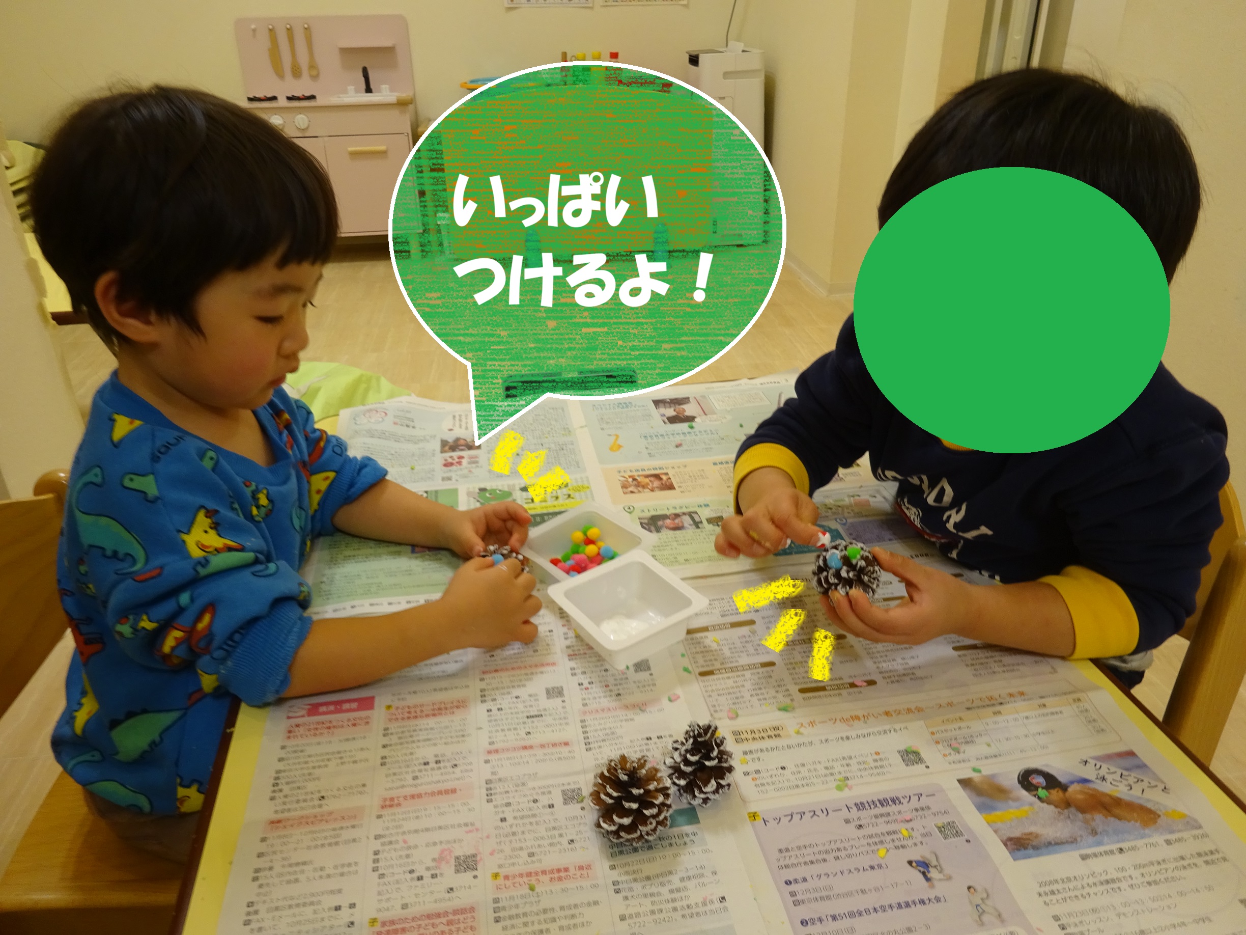 色つき粘土を手で捏ね👐、リースやツリー🎄に拾ったどんぐりや木の棒、丸いポンポンをどう飾るか自分で考えながら製作🎀