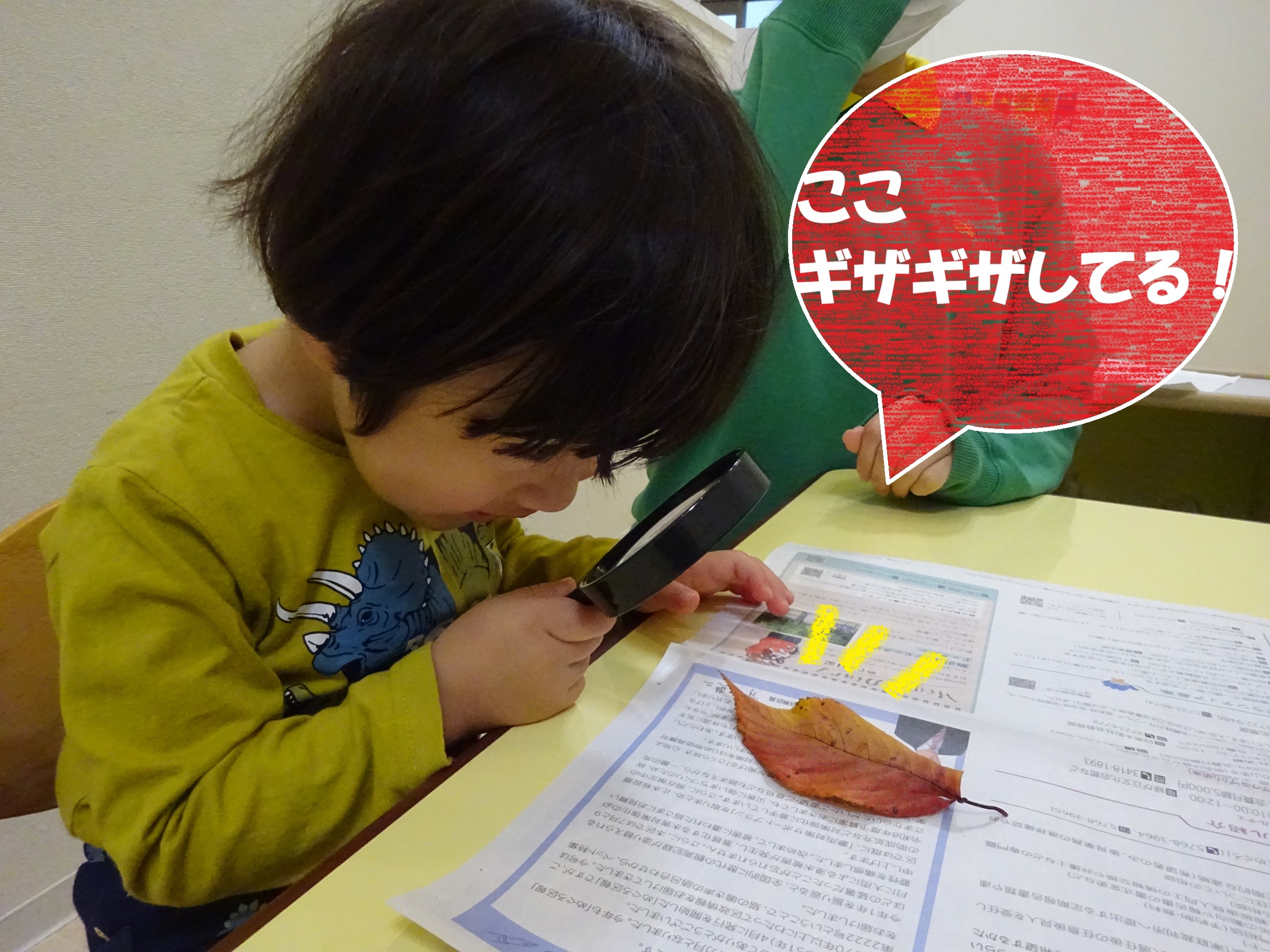 室内に戻って拾ってきたものを広げると、子どもたちは虫眼鏡でじっくり観察🔍