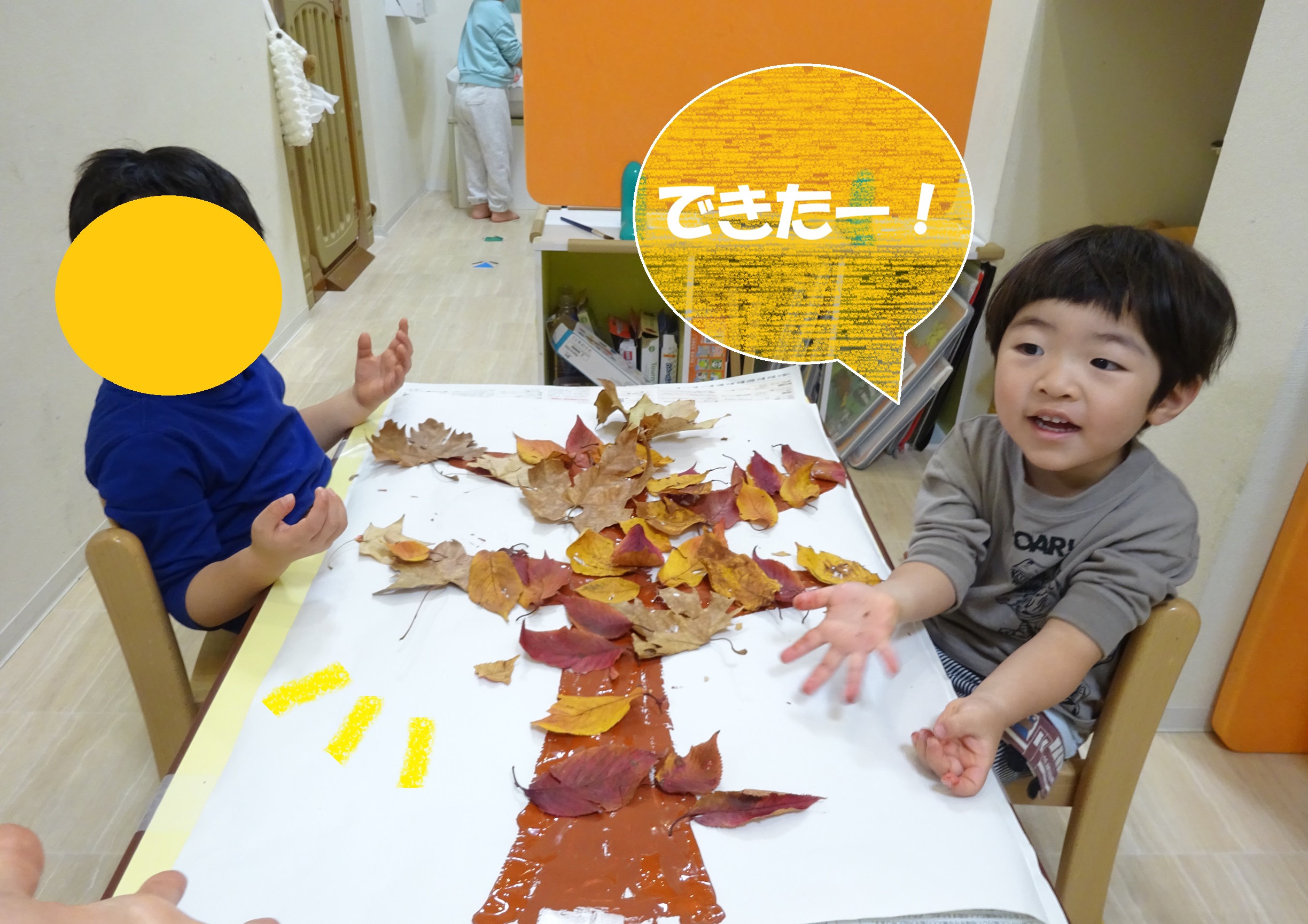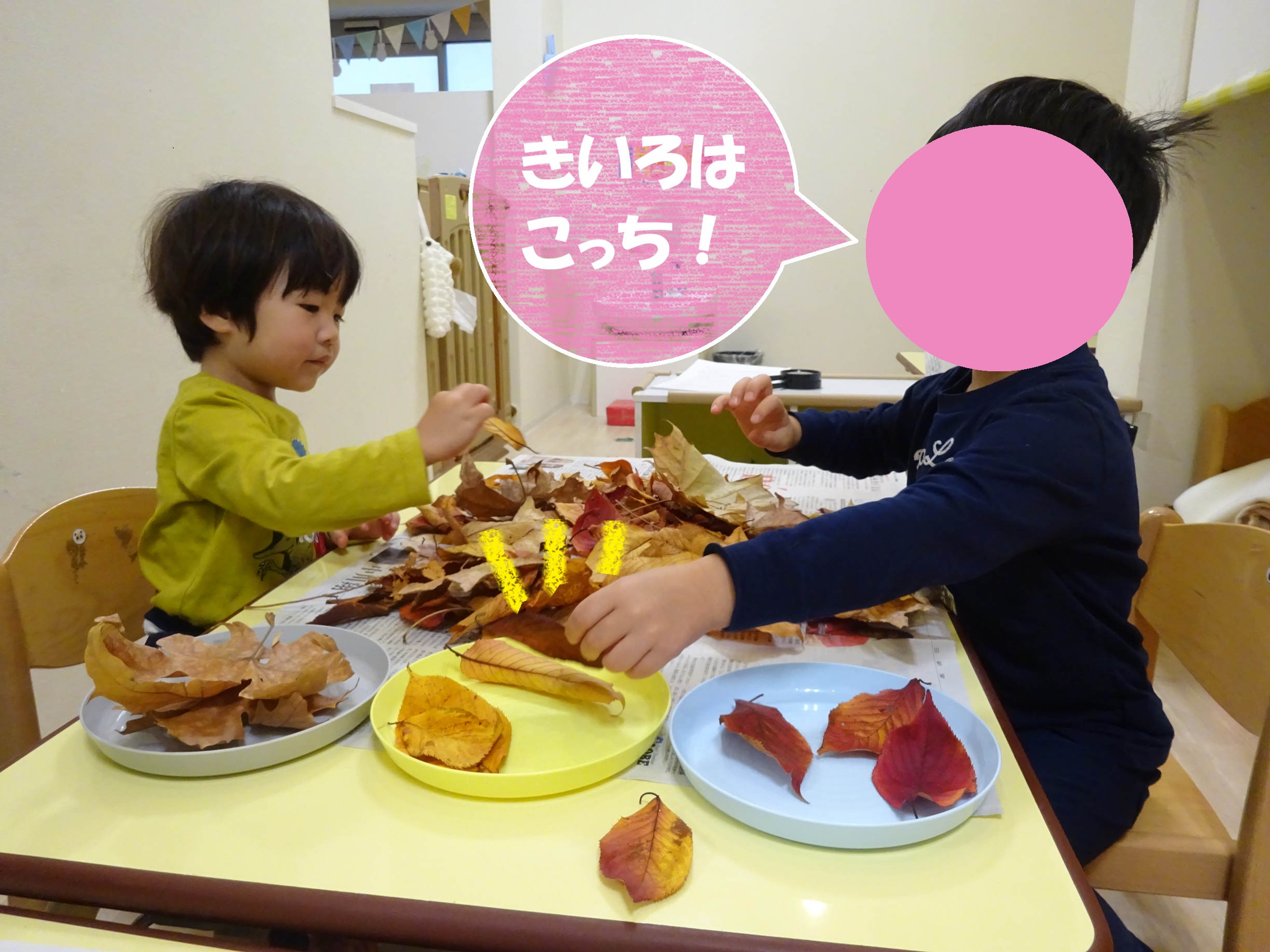 拾った葉っぱを色ごとに分類し、どれを使うか自分で考えながら画用紙に貼り付けました🍂