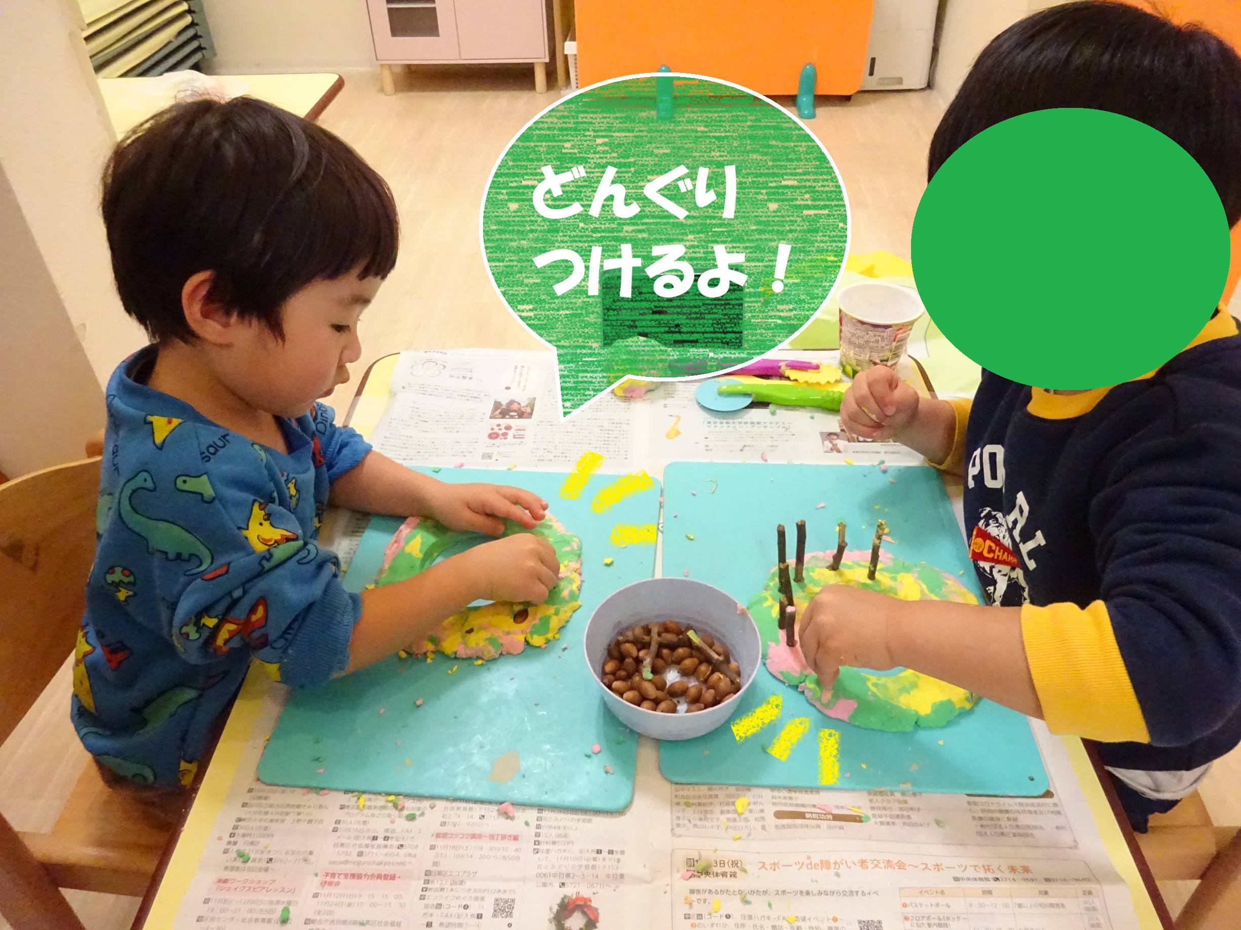 「パン屋さん、ケーキ屋さんみたい!」と想像を膨らませたり、木の棒で粘土に穴をあけてから木の実を入れるなど工夫していました。