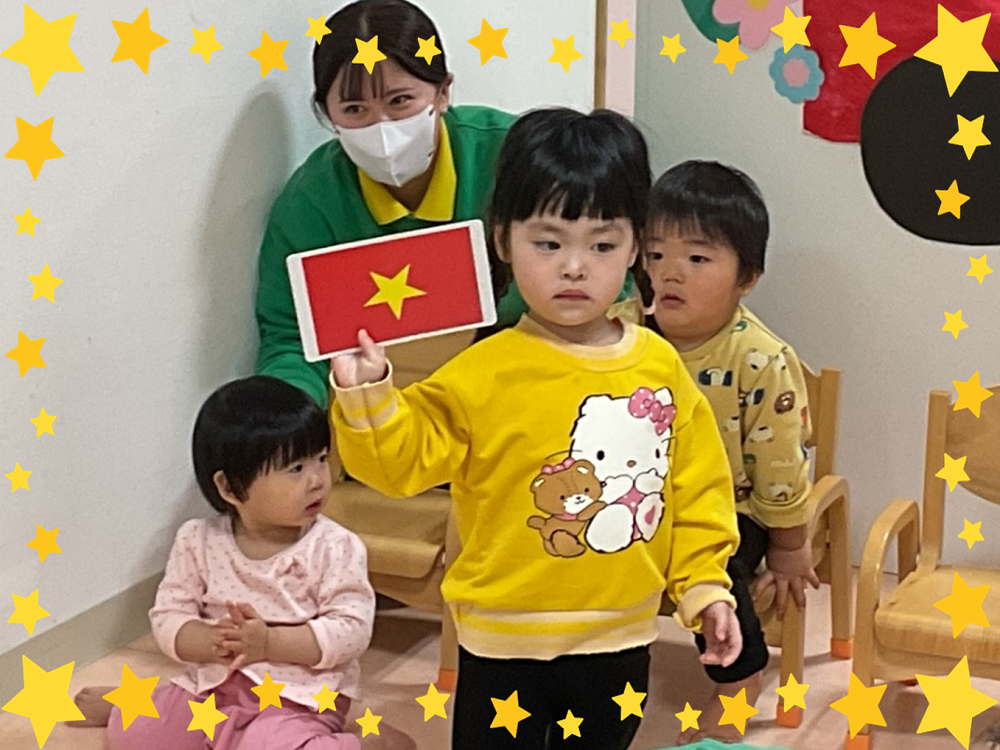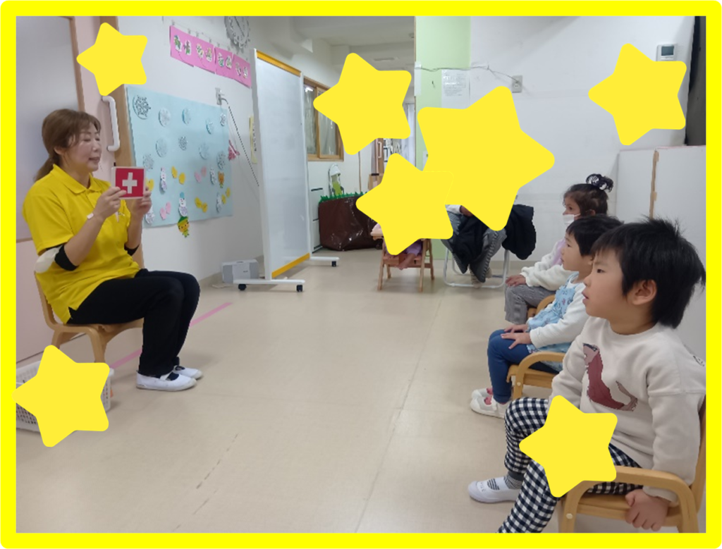 知育では、国旗や生活に必要な物などカードを見て答えたり、保育者が伝えたものと同じカードを持ってきてもらったりする姿を見てもらいました🤗