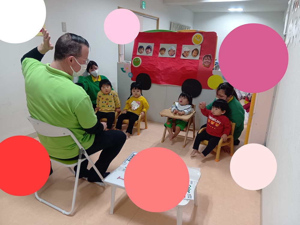 Englishでは、色や音楽♪に合わせて身体を動かしたりしながら普段のEnglish timeの様子を見てもらいました!