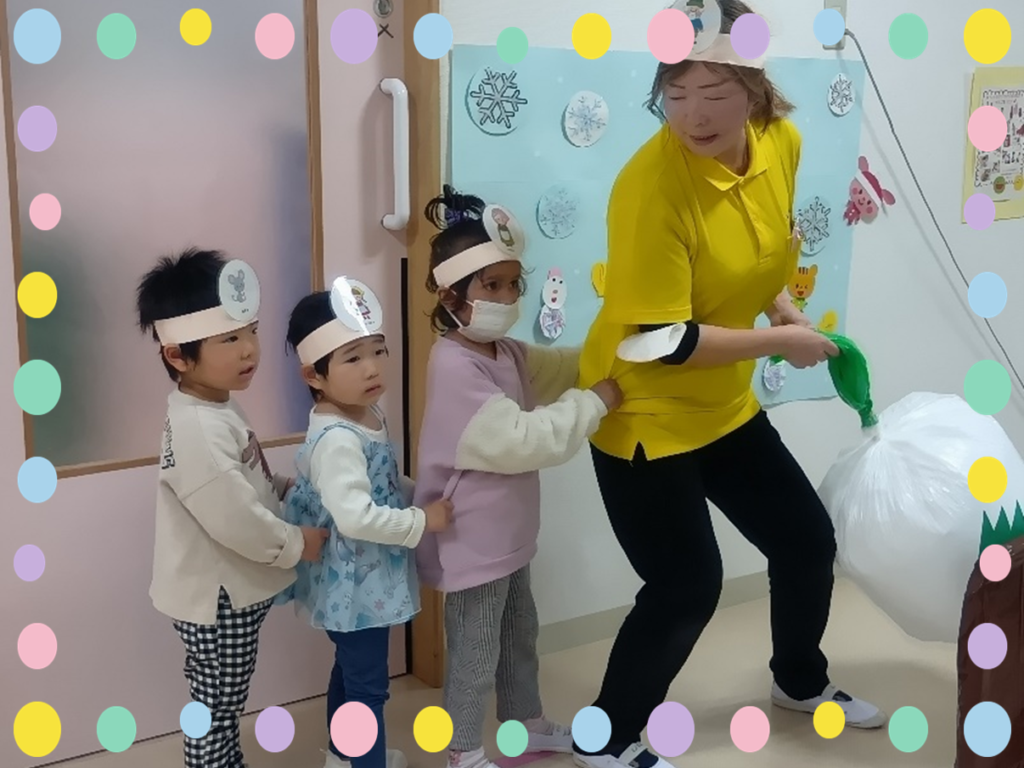 音楽に合わせて返事をしたり、動作をしたりと楽しみながら行っている子どもたちでした。