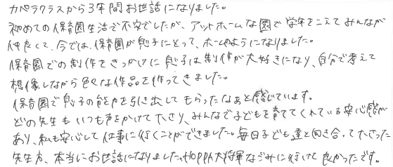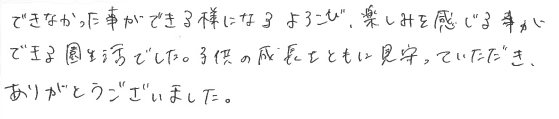 1人1人の性格や得意不得意をしっかり理解し、できない事も否定せず長所を伸ばす保育をしていただいたと感じています。