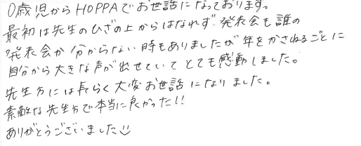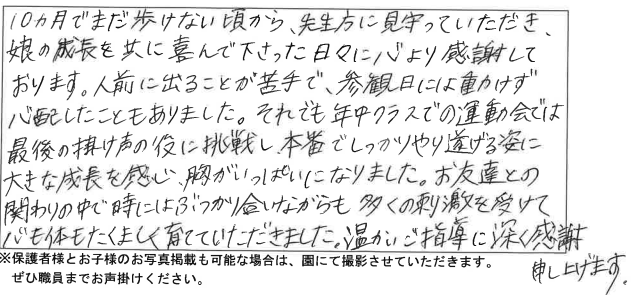 10カ月でまだ歩けない頃から、先生方に見守っていただき、娘の成長を共に喜んで下さった日々に心より感謝しております。