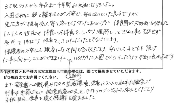また安全面への配慮や日々の生活環境、栄養バランスの取れた給食で行事や季節ごとに給食内容の工夫と手作りのプレゼントも添えてくださり、子供自ら食事を頂く感謝を覚えました。