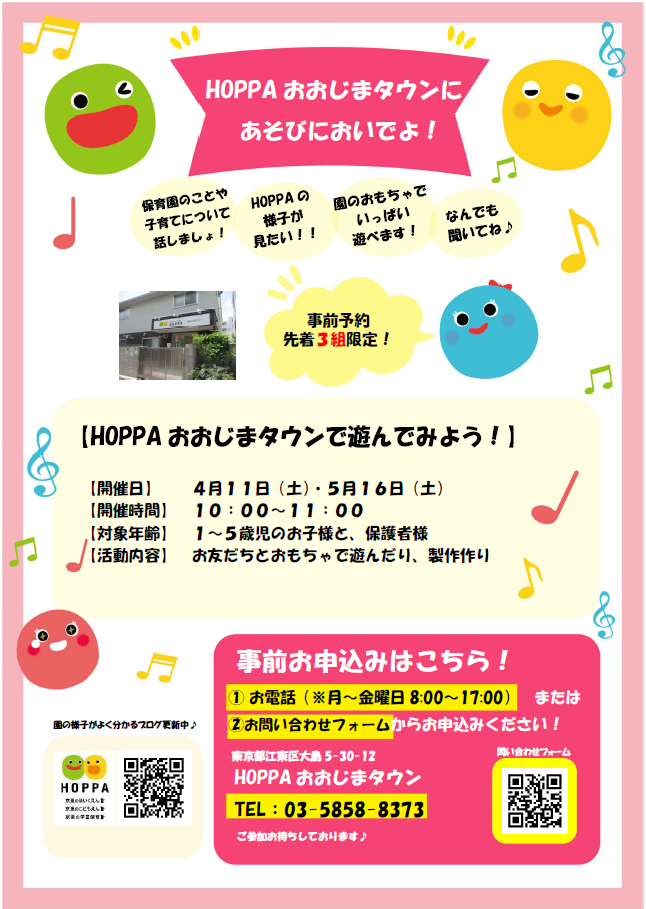 HOPPAおおじまタウン(東京都江東区認可保育園)の園体験イベントのお知らせです😊