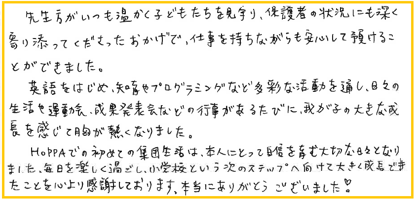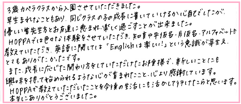 HOPPAでは色々な体験をさせていただき、知育や平仮名・片仮名・アルファベットも教えていただき、英語に関しては「Englishは楽しい!」という意識が芽生え、とてもありがたかったです。