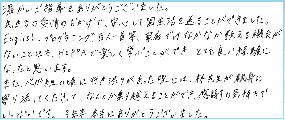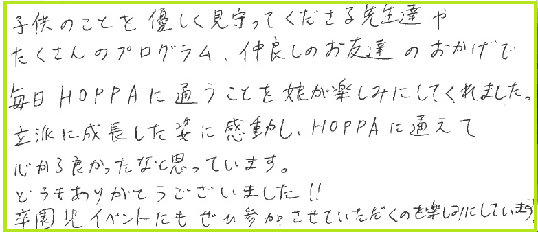 立派に成長した姿に感動し、HOPPAに通えて心から良かったなと思っています。