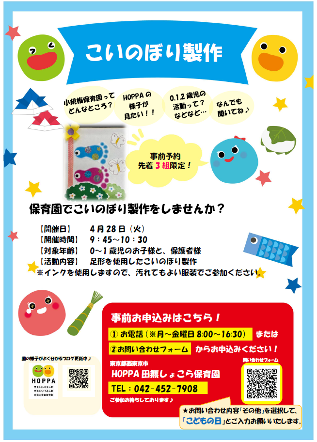【西東京市イベント情報】こいのぼり製作を楽しもう!【HOPPA田無しょこら保育園】