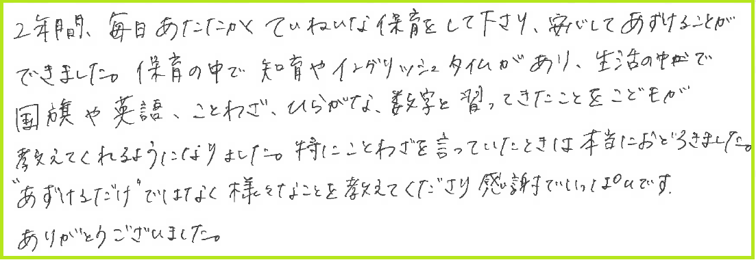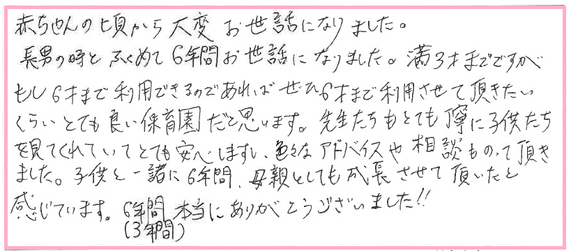2年間、毎日あたたかくていねいな保育をして下さり、安心してあずけることができました。