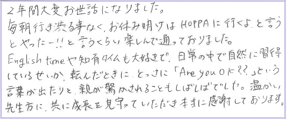 毎朝行き渋る事なく、お休み明けにはHOPPAに行くよと言うとやったー!!と言うくらい楽しんで通っておりました。