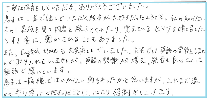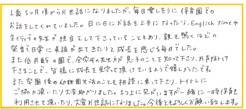 今回のブログでは、卒園児の保護者様からいただいたメッセージをご紹介します😊