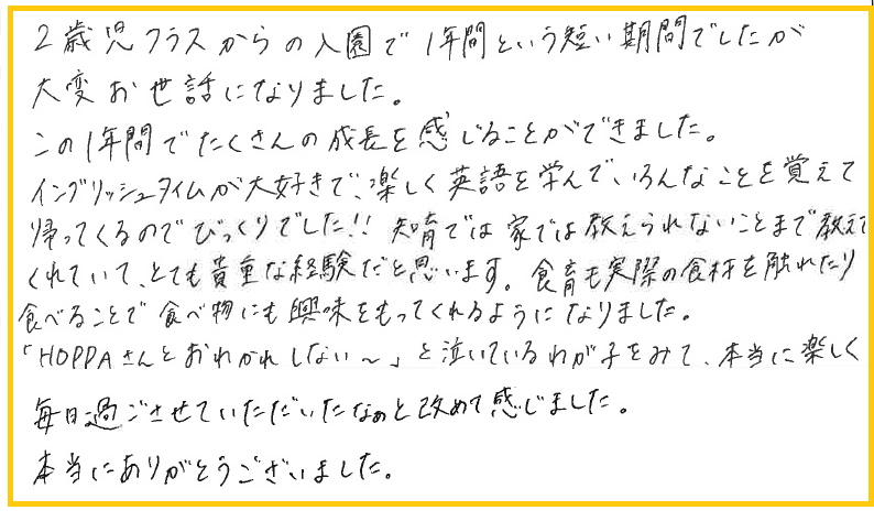 2歳児クラスからの入園で1年間という短い期間でしたが、大変お世話になりました。