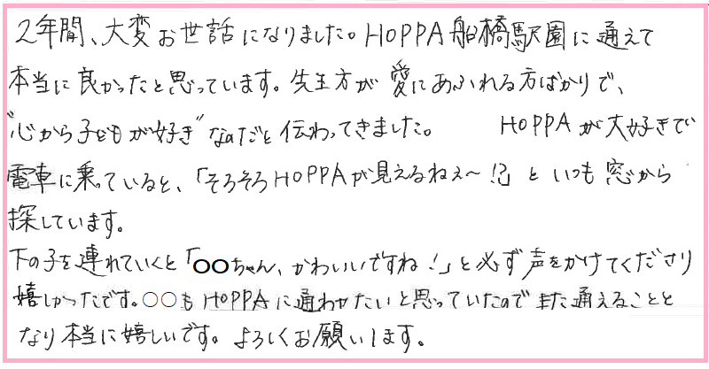 HOPPA船橋駅園に通えて本当に良かったと思っています。