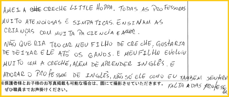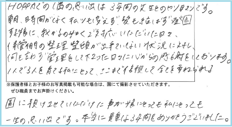 朝時間がなくオムツも変えず、紙を結ばず登園する娘に、我が子の如く対応いただいた日々、保管棚の整理ができていない状況に対し、何も言わず管理して下さった日々に心からの感謝をしております。