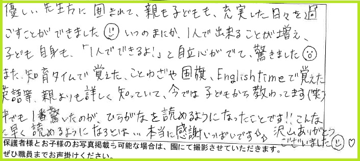 今回のブログでは、卒園児の保護者様からいただいたメッセージをご紹介します😊