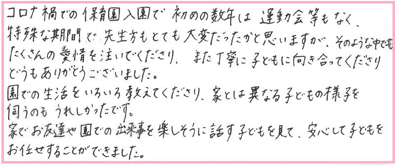 コロナ禍での保育園入園で、初めの数年は運動会等もなく、特殊な期間で、先生方もとても大変だったかと思いますが、そのような中でもたくさんの愛情を注いでくださり、また丁寧に子どもに向き合ってくださり、どうもありがとうございました。