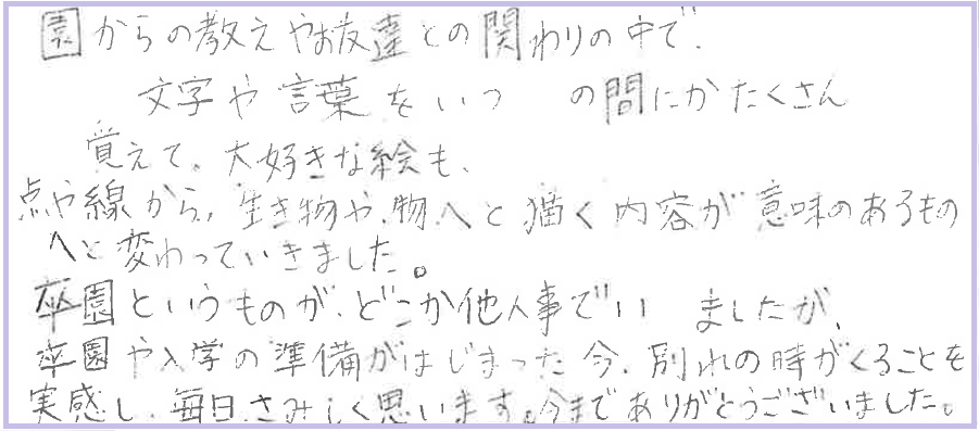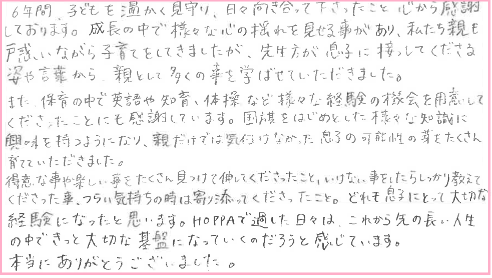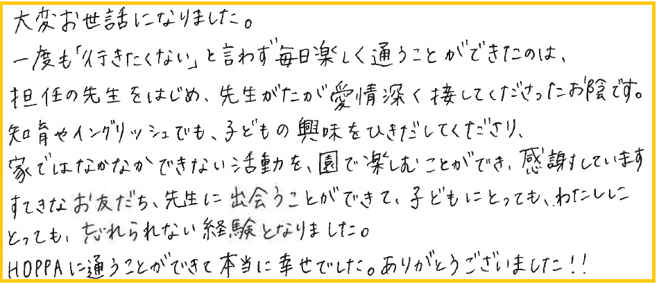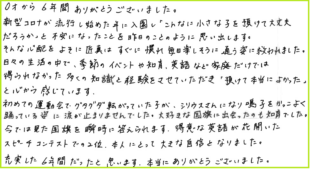 今回のブログでは、卒園児の保護者様からいただいたメッセージをご紹介します😊