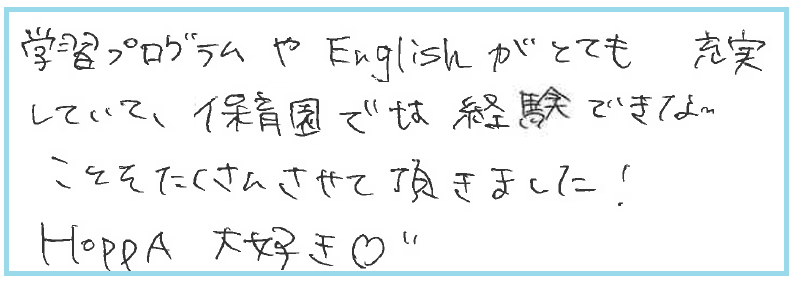 学習プログラムや English がとても充実していて、保育園では経験できないことをたくさんさせて頂きました!