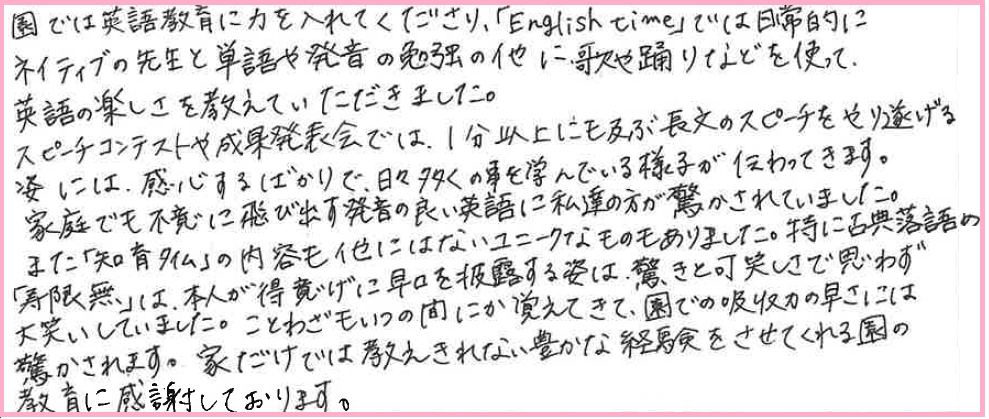また、保育の中で英語や知育、体操など様々な経験の機会を用意してくださったことにも感謝しています。