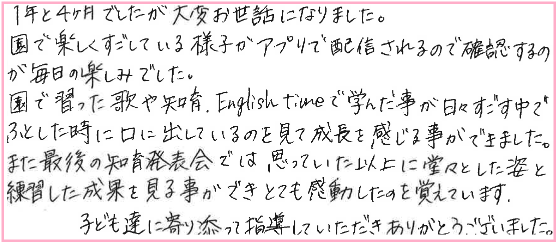 園で習った歌や知育、English timeで学んだ事が、日々すごす中でふとした時に口に出しているのを見て、成長を感じる事ができました。