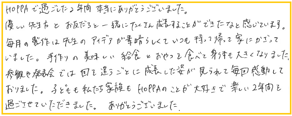 子どもも私たち家族もHOPPAのことが大好きで、楽しい2年間を過ごさせていただきました。