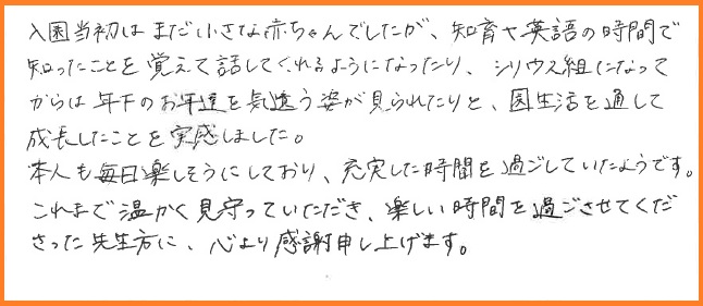 入園当初はまだ小さな赤ちゃんでしたが、知育timeやEnglish timeの時間で知ったことを覚えて話してくれるようになったり、シリウス組になってからは年下のお友だちを気遣う姿が見られたりと、園生活を通して成長したことも実感しました。