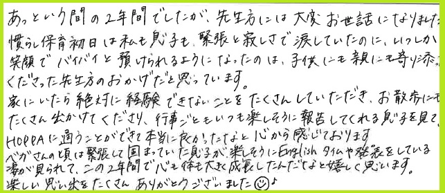 家にいたら絶対に経験できないことをいつも楽しそうに報告してくれる息子を見て、HOPPAに通うことができて本当に良かったなと心から感じております。