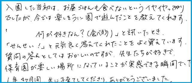 毎日楽しく登園している様子を見て、園での様子が目に浮かぶようでした。