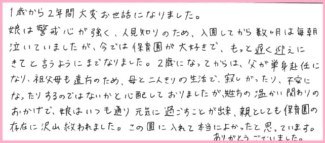 2歳になってからは、父が単身赴任になり、祖父母も遠方のため、母と二人きりの生活で、寂しがったり、不安になったりするのではないかと心配しておりましたが、先生方の温かい関わりのおかげで、娘はいつも通り元気に過ごすことが出来、親としても保育園の存在に沢山救われました。